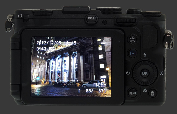 To the right of the LCD are 4 independent buttons plus the already mentioned lower-rear control-dial which is also a 4-way controller with central OK button. The combined AE-L/AF-L is customizable. It can lock exposure, focus or both. For AE-L, it lock exposure while being pressed or when pressed until pressed again. The latter is useful when shooting multiple images for a panorama for example. Note that the Panorama Assist mode does this automatically. There also a Playback, Menu and Delete button which work exactly as expected. In Capture mode, Delete prompts for deletion of the last image or video.